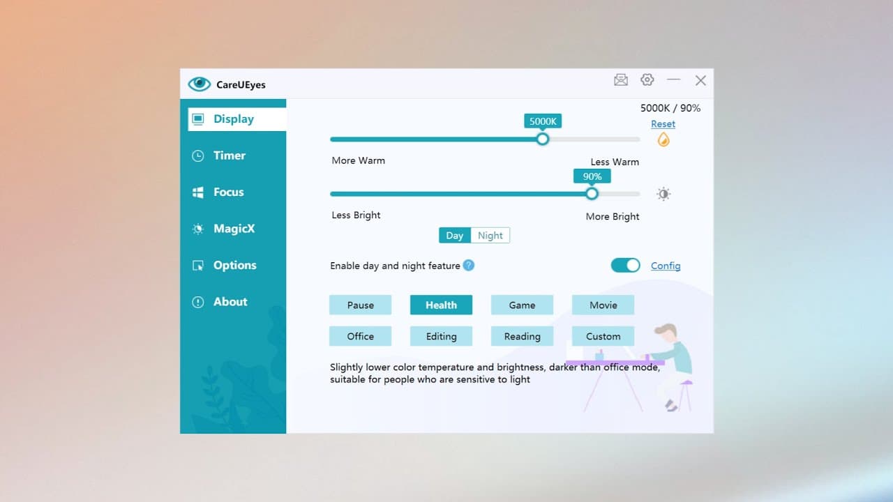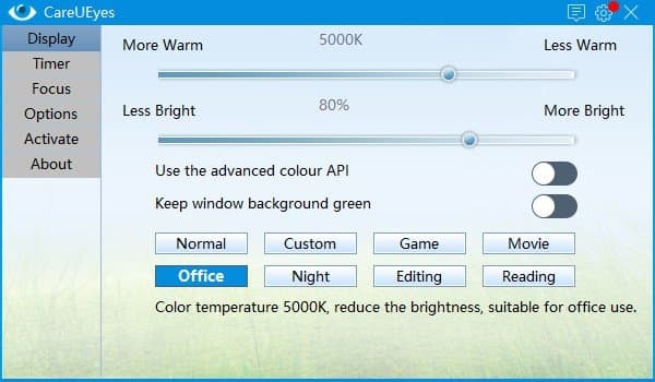 CareUEyes Pro helps you soften the lighting to reduce eye strain and provide comfort, and also provides a timer to remind you to take breaks.